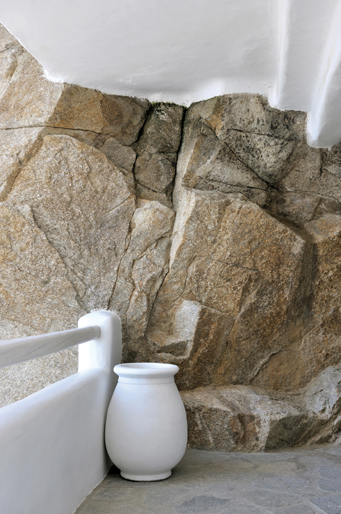 언뜻 호텔 건물이 키클라데스제도의 마을 곳곳에 있는 옛날 전통 가옥의 원형과 다른 것은 없어 보인다. 늘 눈부신 햇빛과 어우러지도록 한 섬 지방의 전통 양식과 하모니를 이루고 있는 이 호텔은 절벽 꼭대기에 위치해 흰색 석회칠을 한 여러 개의 건물로 구성되어 있다. 각 건물은 마치 미코노스의 골목길처럼 미로같이 복잡한 계단으로 연결되어 있다. 택시가 당신을 호텔 입구에 내려놓는 순간, 이곳에서 지내는 날들이 특별할 것임을 예감하게 될 것이다. 호텔 리셉션 공간은 모두 흰색으로 이루어져 있다. 이토록 이상적인 데커레이션 속에서 바다를 마주하고 서 있다 보면 눈은 하늘과 바다, 수영장이 만들어내는 넘치도록 풍부한 푸른빛으로 충만해진다.