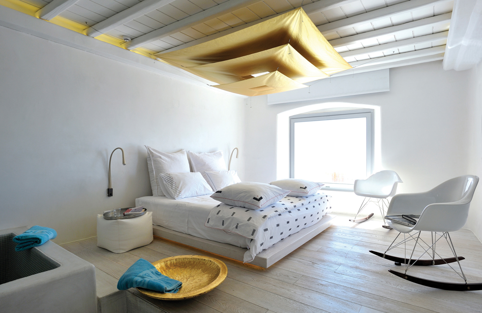 11 각 객실은 화이트와 블루 톤의 데커레이션으로 키클라데스제도가 지닌 컬러 팔레트를 재현한다. 모든 것은 그늘과 태양을 즐길 수 있도록 되어 있고 사주식 침대에 드리운 캐노피는 굵은 장식줄 밴드로 제작했다.