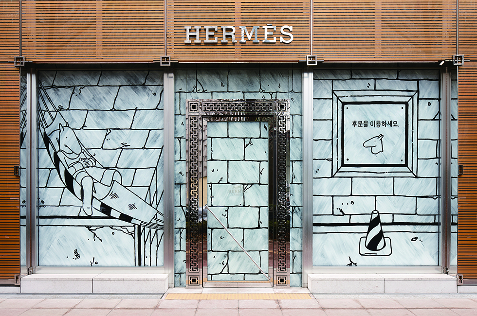 에르메스는 메종 에르메스 도산파크가 새 단장하는 과정을 드로잉으로 표현한 특별한 윈도 디스플레이를 공개했다.