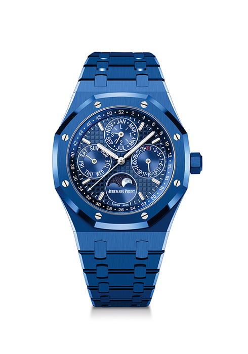스위스의 하이엔드 워치메이킹 브랜드 오데마 피게에서 주력 제품으로 로열 오크 퍼페추얼 캘린더를 제안한다. 케이스와 브레이슬릿 전체에 블루 세라믹을 최초로 적용한 41mm 로열 오크 퍼페추얼 캘린더는 블루 그랑 타피스리 패턴 장식의 다이얼과 별이 빛나는 밤하늘을 담은 블루 카운터가 시계의 블루 색조와 완벽한 매치를 이루는 것이 특징이다. 셀프 와인딩 5134 칼리버에 20m 방수 기능과 40시간의 파워 리저브로 견고함을 더했다.