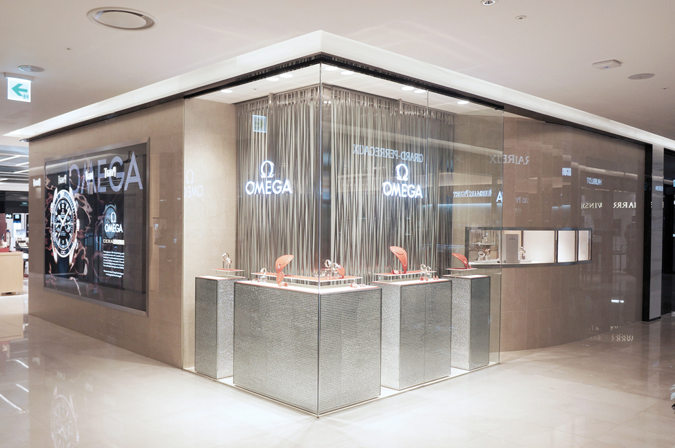 둥근 형태의 백 월(Back Wall)과 대리석 외벽, 대형 사이즈의 광고 비주얼은 오메가의 아이덴티티를 드러내기에 부족함이 없다.