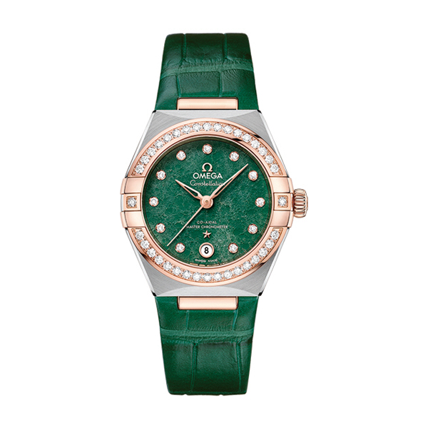 그린 컬러의 천연 어벤추린 스톤으로 제작한 다이얼과 다이아몬드를 파베 세팅한 베젤이 조화를 이루는 컨스텔레이션 코‑액시얼 마스터 크로노미터 29MM
