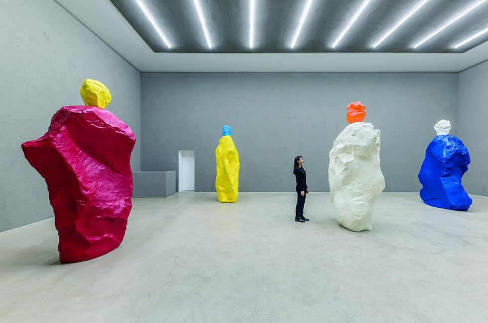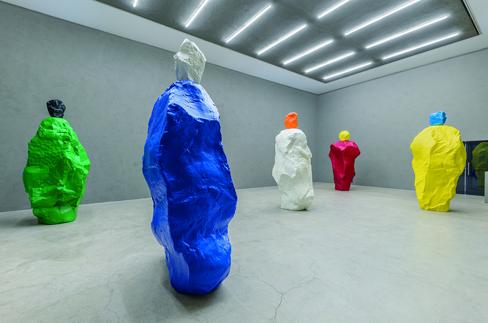 ‘돌’이라는 소재가 지닌 힘은 우고 론디노네(Ugo Rondinone)의 손길을 만나면 특별한 미학적 오라를 품는 듯하다. 2013년 뉴욕 록펠러 센터 광장에서 ‘human nature’라는 이름으로 처음 우고 론디노네의 기념비적 청석 조각 작업이 소개된 이래 2016년 네바다 사막 위에 설치한 돌탑 형상의 거대한 작품 ‘Seven Magic Mountains’는 세계적으로 큰 주목을 받았다. 그리고 올봄, 국제갤러리 서울에서 그의 돌 조각이 다시금 존재감을 드러냈다. 국제갤러리 K3관의 6m 정도 되는 높은 층고를 활용한 5점의 ‘nuns and monks’ 연작은 언뜻 커다란 돌덩어리처럼 보이지만 안이 비어 있는 청동 조각이다(본래 작은 크기의 석회암 모형으로 제작된 작품을 스캔하고 확대해 청동 주물로 다시 탄생시킨 것이다). 제목이 말하듯, 성인(聖人)의 신비한 모습을 띠고 있지만 우상적 상징성으로 짓누르기보다는 관람객을 환영하는 ‘열린’ 존재를 의도했다고 한다. 작가는 언제든 일정한 색조의 작품을 보여주기 위해 차분한 조명만이 작품을 비추도록 전면 유리창을 필터로 감싸 빛을 되도록 차단했다. 그리고 모래 자국 같은 무늬를 띤 진회색의 시멘트를 전시 공간 전체에 발라 바닥과 벽이 단일한 콘크리트처럼 보이도록 했다. 이는 마치 구름 덕분에 그늘이 살짝 진 느낌을 들게 한다. 그리고 이 같은 날씨에 대한 암시는 부산의 전시 공간에서도 이어진다. 역시 유리창에 자외선 차단 필터를 씌운 공간에 작은 ‘mattituck’ 회화 시리즈 17점이 잔잔하게 빛을 발하고 있다. 작가의 스튜디오가 있는 뉴욕 롱아일랜드 매티턱에서 본 노을을 묘사한 이 앙증맞은 소품 시리즈는 지역명을 그대로 차용한 섬세한 수채화 연작으로 각각의 작품은 오로지 세 가지 색으로만 이루어져 있다.