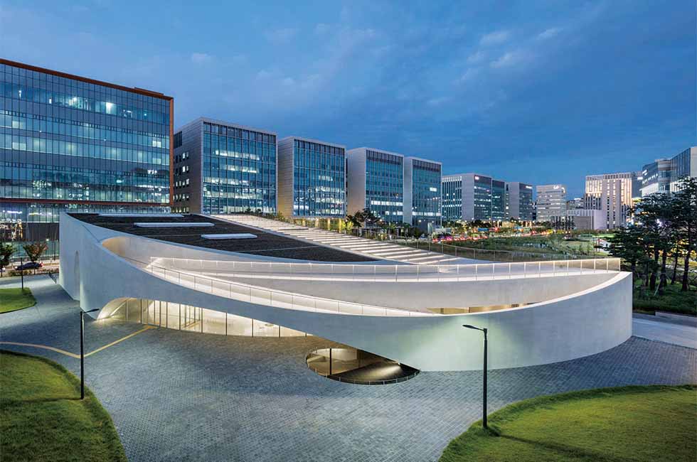 4 새로운 산업 지구로 부상 중인 마곡동에서 곡선의 아름다움이 잘 드러나는 건축의 미학 덕분에 남다른 인상을 자아내는 스페이스K 서울은 건축가 조민석이 설계 작업을 이끌었다. © 신경섭