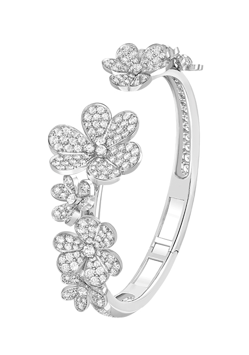 올해 반클리프 아펠에서 공개한 프리볼(Frivole) 컬렉션의 브레이슬릿은 7개의 화이트 골드 플라워 모티브로 완성해 우아함의 정수를 보여주는 작품이다. 꽃잎을 활짝 피워낸 디자인이 총 3백 개의 다이아몬드와 어우러져 독보적인 고급스러움을 완성한다. 가장 엄격한 기준에 맞춰 선별한 젬스톤이 조화를 이루며 피부 위에서 강렬한 광채를 선사한다. 특히 비대칭으로 구현한 디자인과 기울어진 곡선형 하트 형태의 잎은 자연의 아름다움을 여실히 보여준다. 문의 1877-4128