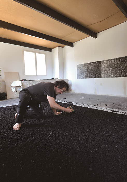 커다란 캔버스 위에 숯을 깔아 붙이고 한지로 덮은 후, 이를 쇠 브러시로 문지르고 두드린 다음 수십 겹의 한지를 반복해서 붙이는 작업. 일종의 수행과도 같은 반복된 행위 속에서 숯의 형상은 사라지고 한지 위로 우둘투둘한 질감이 드러나면서 작품의 입체감이 부각된다. 이처럼 한지와 먹, 숯 등을 활용한 자신만의 방식으로 한국의 멋과 정신을 담아낸 고유의 작품 세계를 펼치면서 프랑스에서 활동해온 이진우 작가의 개인전이 오는 8월 18일부터 9월 3일까지 조선일보미술관에서 열린다. 지난해 국내 첫 개인전의 앙코르전으로, 5백 호 대형 작품을 비롯해 최근작 20여 점을 만날 수 있는 기회다. 이진우는 1980년 이후 지금까지 프랑스에서 활동하고 있는 한국인 작가로 ‘한지(韓紙)의 거장’으로 통한다. 유럽에서 서양미술을 공부하면서도 한국인으로서의 정체성을 추구하다 보니 한지와 먹을 택했다고 한다. 꾀부리지 않고 몸이 녹초가 될 때까지 반복하는 강도 높은 작업으로 자신의 생각과 마음을 내려놓는다는 작가의 태도와 철학이 담겨 있기 때문일까? 작품을 감상하노라면 겸허하고 은은한 울림이 이는 듯하다. 일각에서 그의 작품 세계를 단색화의 감성과 맞닿는다고 평가하는 이유일 것이다. 전시는 오전 10시부터 오후 5시까지.