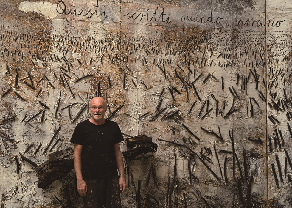 1 Anselm Kiefer, Croissy, 2022 © Anselm Kiefer Photo: Georges Poncet 다수가 올해 베니스 비엔날레 최대 화제작으로 꼽은, 팔라초 두칼레 전시에서 선보인 작품 중 하나를 배경으로 서 있는 안젤름 키퍼. 전시 제목이기도 한 ‘Questi scritti, quando verranno bruciati, daranno finalmente un po’ di luce’라는 문장의 일부가 보인다. 베니스 철학자 안드레아 에모의 글에서 차용한 것으로 이탈리아어로 ‘이 글이 다 타버리고 나면 마침내 한 줌의 빛을 비추리라’라는 뜻을 지녔다.