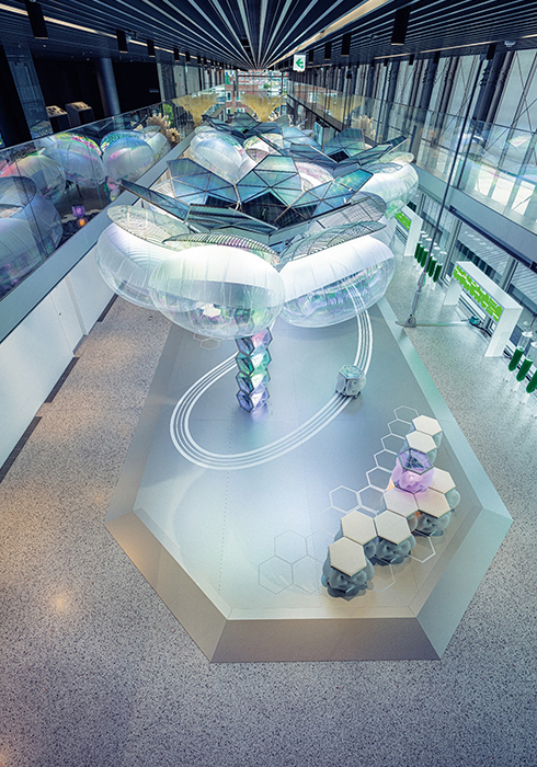 2 주변 환경과 사람들을 감지해 유연하게 구성되는 바래스튜디오의 ‘에어 오브 블룸(Air of Blooms)’. 하늘을 향해 설치된 태양전지 패널이 스스로 에너지를 축적해 공급한다.