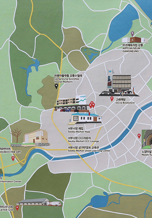 지난 8월 27일에 개막한 ‘금강자연미술비엔날레’는 야외 전시 공간인 공주 연미산자연미술공원을 무대로 펼쳐지고 있다. 올해 10회를 맞이했는데, 원류를 들여다보면 무려 40년 전으로 거슬러 올라간다. 1981년 국내 최초의 자연 미술 운동인 ‘야투’ 그룹의 활동을 바탕으로 자연과 인간을 둘러싼 담론을 꾸준히 생산해오고자 한 이력을 지녔다. 10개국에서 26명의 작가들이 참여해 이달 말까지 진행되는 이번 비엔날레의 주제는 ‘또, 다시 야생(多視 野生)’으로, 인간의 무분별한 행태로 초래된 환경 파괴에 맞서 자연과 생태를 정복이나 개발, 관리의 대상으로부터 ‘본래의 상태’로 되돌려 인간과의 화합을 추구하는 ‘재야생(rewilding)’을 둘러싼 다양한 시각과 개념을 풀어 쓴 제목이다. 2012년 처음 열린 창원조각비엔날레는 또 다른 특화 비엔날레로, 명칭에서 알 수 있듯 우리나라에서 유일하게 조각에 집중한 국제 미술전이다. 올해는 ‘채널: 입자가 파동이 되는 순간(Channel: Wave-Particle Duality)’이라는 주제로 26개국에서 90명의 작가를 초대했으며, 성산아트홀, 3·15해양누리공원, 진해 흑백다방과 중원로터리 등에서 1백40여 점의 작품을 선보이고 있다(11월 20일까지). 2015년 첫 단추를 꿰어 주목을 받았지만 여러 이슈로 5년 만에 다시 열리는 제주비엔날레는 오는 11월 16일 드디어 대중에 공개될 예정이다. ‘움직이는 달, 다가서는 땅(Flowing Moon, Embracing Land)’이라는 제목을 내세웠는데, 자연이라는 테두리 안에서 모든 게 서로 연결된 세계의 공존 윤리와 관용을 함축한다고. 기후 위기의 시대에 전 지구적 공생을 향한 예술적 실천을 찾는 데서 출발했기에, 제주도의 자연 지형과 생태가 인간의 시간과 사건으로 연결된 여섯 곳의 장소를 무대로 정했다. 주제관 두 곳(제주도립미술관, 제주현대미술관)을 비롯해 제주국제평화센터, 삼성혈, 가파도 AiR, 미술관옆집 제주 등 네 곳을 위성 전시관으로 삼았다. 참여 작가는 16개국 55여 팀으로 구성됐다. 강릉에서는 파마리서치문화재단의 주최로 11월 4일 ‘강릉국제아트페스티벌(GIAF)’이라는 미술 축제가 첫선을 보인다. 시각 예술, 공연 예술, 문학, 다원 예술 등 문화 예술을 폭넓게 아우르는 접근 방식이 눈길을 끄는 GIAF 제1회 행사는 예로부터 풍부한 놀이 문화를 보유해 온 강릉의 역사와 삶에 대한 연구를 기반으로 예술과 사람을 이어주는 ‘통로’ 역할을 지향한다는 맥락에서 ‘강/릉/연/구 江陵連口 Tale of a City’라는 제목을 택했다. 입에서 입으로 전해지는 이야기, 연속된 문처럼 이어지는 강릉의 공간과 풍경, 토착민과 이주민, 그리고 앞으로 이주하고자 하는 사람들, 시간을 잇는 서사, 다양한 장르의 아티스트와 전문가의 연결을 뜻하는 다의성을 띠는 제목이다. 그래서 전시 기획자, 현대미술가, 바우길 개척자(산악인), 소셜 요리가, 그래픽 디자이너, 인권 활동가, 도시 인류학자 등 여러 분야의 전문가가 참여했다. 노암터널, 서부시장 예집, 서부시장 CCC라운지, 고래책방, 대추무파인아트, 크리에이티브 1230, 여행자플랫폼 강릉수월래 등 페스티벌 동선도 흥미롭다.