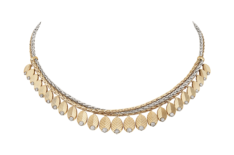 2 옐로 골드와 화이트 골드에 다이아몬드를 세팅한 네크리스로 보디의 움직임에 작은 알갱이들이 경쾌하게 반응한다.