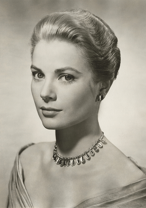 5 1956년, 파우스토 피세디(Fausto Picedi)가 촬영한 모나코 대공비 그레이스 켈리의 사진. 1955년 까르띠에 파리에서 선보인 커피 원두 모티브의 네크리스와 이어링을 착용했다.