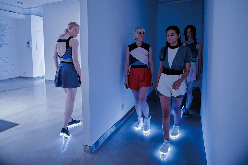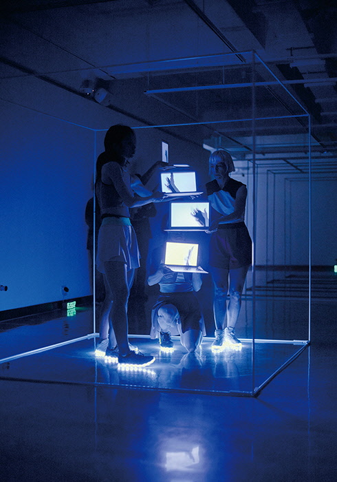지난 2월 26일 광주 동구에 위치한 은암미술관 1층 전시장. 오전 11시가 되자 푸르스름한 기운이 도는 어두운 공간에는 반짝이는 야광 운동화를 신은 여성 댄서들이 등장했다. 랩톱 컴퓨터(맥북)와 휴대폰을 든 4명의 댄서는 백색 알루미늄 구조물만 놓인 공간 여기저기를 느릿느릿 다니면서 때로는 눕기도 하고 때로는 앉기도 하고, 홀로 다니기도 하고 짝을 이루기도 한다. 맥북을 집어 들어 눈, 코, 입을 가리면서 동작을 할 땐 컴퓨터 스크린에 그들의 (대개 무표정한) 얼굴이 나오는데, 어쩐지 서늘하다! 알루미늄 구조물로 구획한 공간 주위에서 펼쳐지는 이들의 움직임에 따라 ‘네트워크 공간’이 계속 생겨나고, 관객들 역시 그 사이의 공간을 걸어 다니면서 작품의 일부가 된다. 필자 역시 그들을 열심히 따라다니면서 촬영을 하고 눈도 맞춰보지만 쌔~ 하게 돌아오는 상대방의 시선은 뭔가 거리감을 느끼게 한다. 소셜 미디어로 촘촘히 연결된 가상 공간에서 끊임없는 소통과 상호작용을 꾀하지만, 여전히 외롭고, 아니 외려 더 고독감을 느끼는 현대인들의 초상이랄까? 몸은 디지털에 함몰되면서 의식은 따로 노는 ‘분절’도 엿보인다. 공연 제목처럼 ‘따로, 또 같이(alone together)’를 여러모로 잘 보여주는 연출이 아닐 수 없다. 한 세션이 60분에 걸쳐 진행되는 이 라이브 퍼포먼스의 후반부로 가면 4명의 댄서는 서로에게 다가서면서 맥북을 치켜든 채 ‘집단적 기념비’ 같은 장면을 만들어낸다. 마치 디지털 시대의 상징적인 브랜드 애플을 찬미하는 듯한 ‘테크노 조각’에 다름 아니다. 스위스 안무가인 안나 안데렉(Anna Anderegg)이 다국적 팀을 꾸려 선보인 <얼론 투게더>의 세계 초연은 60분이라는 시간이 무색하게 휙 지나가버렸다. “브라보!” 박수가 터졌다.