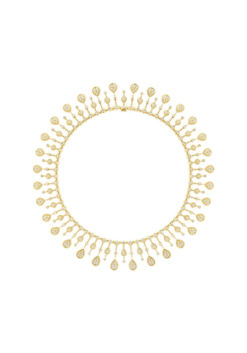 관능적인 뱀의 모습에서 영감을 얻어 1968년 디자인한 쎄뻥 보헴 컬렉션은 뱀의 머리를 상징하는 ‘드롭 모티브’와 ‘허니콤’ 틀을 사용하고 끌을 이용해 뱀의 비늘을 사실적으로 구현, 보헤미안적 느낌을 풍성하게 표현했다. 총 11.7캐럿의 라운드 다이아몬드 6백40개를 세팅한 18K 골드 쎄뻥 보헴 쏠라리떼 네크리스는 화려하면서도 우아한 매력을 자아내며, 다이아몬드 드롭이 후광처럼 반짝여 얼굴을 더욱 화사하게 밝혀준다. 문의 02-772-3508