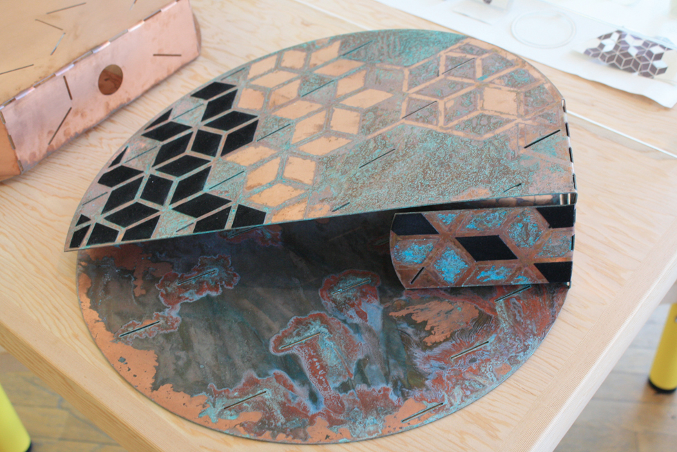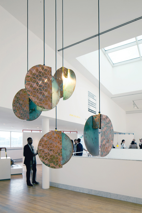 “물체의 표면에 나타나는 결함도 불완전한 속성이 있죠. 저는 언젠가 녹슨 문을 보고는 그러한 결함이 디자인 제품으로는 어떤 식으로 표현될 수 있는지가 궁금했어요.” 이 같은 호기심에서 출발한 불완전한 표면의 흠에 대한 관심은 제이드 폴라위요(Jade Folawiyo)로 하여금 온갖 종류의 금속을 부식시키는 실험을 일삼게 했다. 그리고 마침내 금속의 표면을 변색하거나 녹슬게 하는 방식으로 독특한 표면 마감 처리 효과를 얻는 자신만의 디자인 기법을 터득하게 된 것. 이번 전시회에서 선보인 작품도 이러한 ‘금속 부식’ 기법의 산물로, 마치 아름답게 침식된 행성의 표면을 연상케 하는 전등 갓이다. 오묘한 청록색과 갈색, 연녹색의 조화가 이색적이고 우아한 매력을 뿜어내는 작품이다. “제가 작업을 하면서 깨달은 점은 실험을 하면 할수록 예상치 못한 결과물이 나온다는 것입니다. 금속의 부식으로 얻을 수 있는 색상과 무늬를 제어하는 것은 정말 어려운 일이거든요. 하지만 덕분에 생각지도 않았던 멋진 색상을 만들어낼 수도 있었어요. 힘들지만 즐거운 여정이었죠.” 런던에서 성장했지만 나이지리아 출신의 부모를 둔 제이드는 자신의 뿌리인 아프리카 특유의 정서가 담긴 창조적 감성을 지녔다. 이탈리아 베네통 그룹의 커뮤니케이션 센터인 파브리카에서 1년을 보낸 덕분에 유리와 자기 다루는 법을 익혔고, 이제는 금속으로 범위를 넓히게 되었다는 그는 이 노하우를 활용한 후속 작품을 전시회에 추가로 내놓을 예정이다. 녹색과 갈색이 어우러진 강철 꽃병과 놋쇠로 만든 휴대폰 케이스가 올가을 선보일 작품. “천편일률적인 녹갈색이 아니라 저마다 미묘하게 다른 색깔들이죠. 놋쇠에 새긴 무늬도 유일무이한 것이고요. 개성을 추구하는 대중에게 걸맞은 제품을 선보이고 싶어요.”