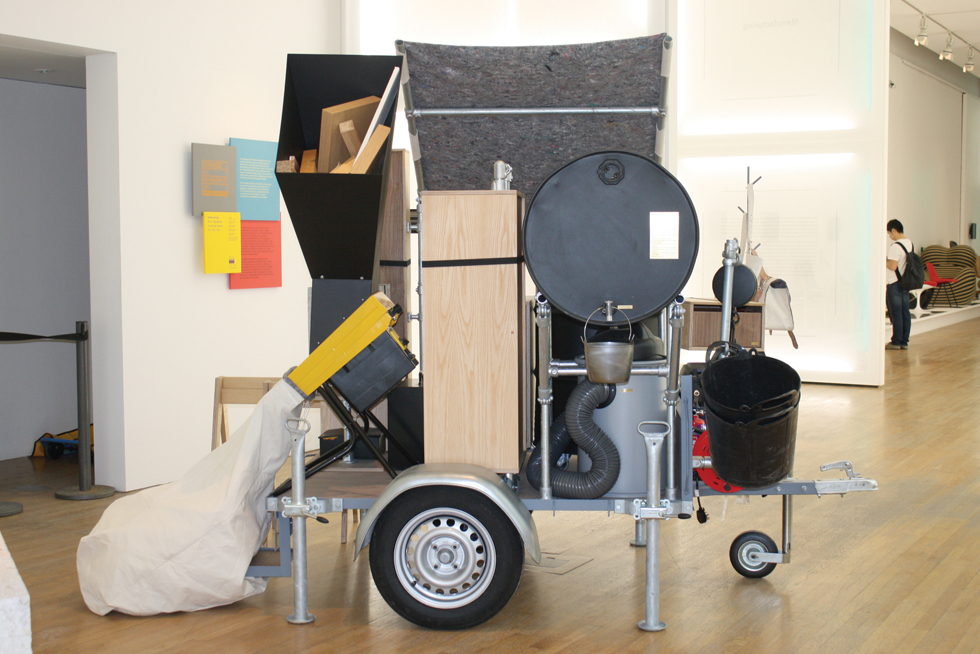 ‘도대체 이게 무엇으로 만든 물건이지?’ 알갱이가 들어 있는 듯한 느낌이 드는 울룩불룩한 하얀색 탁자와 재색 바탕에 진한 노란색을 발하는 전등은 제법 운치가 있다. 한지를 물에 녹여 뭉쳐놓은 듯한 동양적인 분위기도 배어나온다. 보통 눈썰미로는 어떤 재료를 사용해 빚어낸 물건인지 알기 힘들다. 이름하여 ‘모바일 파티클 보드 공장(Mobile Particle Board Factory)’. 알고 보니 독특한 재료와 그 재료를 만드는 공정 자체가 ‘작품’이나 마찬가지란다. 해묵은 목재 가구에서 나온 낡은 재료를 판지용 펄프로 거듭나게 한 실용적인 발상에서 비롯된 작품이다. “보통은 쓸모없다고 여기는 갖가지 재질의 목재 가구에서 얻은 입자 고운 재료를 두루 섞어 독특한 느낌의 판지(chipboard) 펄프를 얻었죠. 이렇게 만든 판지 재료에는 원래 목재의 흔적이 엿보여 색다른 분위기를 풍겨요. 판지는 밀리미터 단위로 완벽하게 생산하는 고도의 산업화가 탄생시킨 산물이지만, 가장 가치를 인정받지 못하고 있는 재료 중 하나가 아닐까 생각합니다.” 영국의 걸출한 조각가 앤서니 곰리의 조수로 일하다가 현재 디자이너 마르티노 갬퍼의 스튜디오에서 활동하고 있는 디자이너 윌 섀넌(Will Shannon)은 이렇게 말했다. 섀넌의 작품 세계를 보노라면 최종 결과물인 가구도 재미있지만 창작물을 만들어내는 도구에 더 흥미가 느껴진다. 그래서 ‘섀넌표’ 판지 펄프로 제작한 탁자와 전등 옆에는 드럼통과 양동이 등 온갖 잡동사니를 얹어놓은 듯한 수레 모양의 장비도 함께 전시되어 있다. 고물상이 끌고 다니는 장난감 수레처럼 보이는 이 기계를 활용해 가구 재료를 만드는 공정은 디자이너와 가구를 만드는 장인, 제조업체의 역할이 하나로 통합될 수 있다는 걸 증명한다고. 단순한 기계가 아니라 디자이너의 아이디어에 날개를 달아주는 작은 작업장인 셈이다.