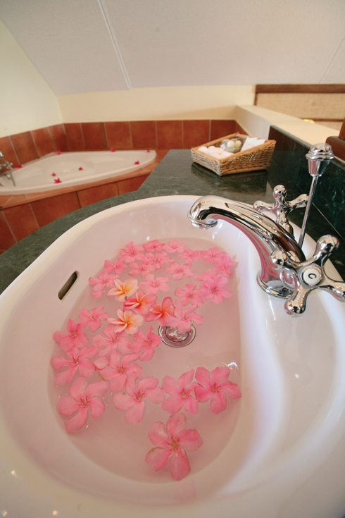 6 리조트 정원에 핀 꽃을 따 욕조를 장식해놓은 리조트.