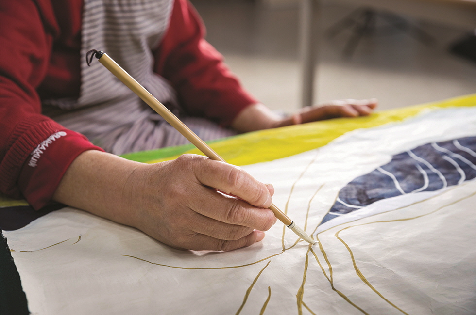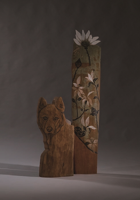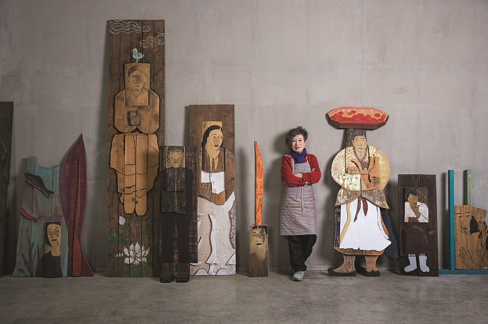 약 3,300m2(1천 평) 남짓한 대지에 시원스레 펼쳐진 2층짜리 건물. 소형 잠수함 정도는 너끈히 소장할 수 있을 듯한 규모다. 천 개 단위의 목조각 설치 작업을 한 공간에 늘어놓는 식으로 워낙 담대한 스케일로 작업하는 윤석남과 자못 어울리는 공간이 아닐 수 없다. 빨간색 니트 상의에 작업용 앞치마를 두른 채 마중 나온 그녀를 따라 안으로 발걸음을 옮기니 기분 좋은 생동감이 뿜어져 나오는 ‘현장’의 모습이 시야에 들어온다. 드로잉과 채색을 하는 작업대, 나무를 다듬는 데 쓰는 듯 보이는 기계들, 한쪽에 가지런히 세워져 있는 목조각상들…. 작가의 과거와 현재, 그리고 미래까지 아우르는 사유와 몸부림을 품은 공간이어서일까. 아티스트의 작업실에서는 널브러진 도구나 작은 나무 조각 같은 사소한 것마저도 은근한 설렘과 호기심을 불러일으키곤 한다. 마침 서울 학고재 갤러리에서 열리는 개인전을 앞두고 있던 터라 미리 그녀의 ‘신작’을 살짝 구경하는 행운도 누렸다. 한지에 채색을 한 초상 시리즈인데, 벽에 기대어 있는 몇몇 작품을 가만히 들여다봐도 그다지 잘 알려진 인물들 같지는 않다. 그녀의 설명인즉슨 여성 독립운동가들이란다. 우리는 대개 유관순 열사만 기억하지만 역사적 기록에는 2천 명가량의 이름이 존재한다고. 다만 얼굴이 없는 경우가 다수다. “(독립운동가를 다루는 건) 처음인데 자료가 별로 없어요. 그래도 1백 명 정도는 하고 싶어요. 얼굴 있는 사람은 다 하려고요.” 작업대 위에 펼쳐진 채색 초상화를 가리키면서 “초지를 올려놓고 먹으로 그대로 뜨고…”라면서 세세히 설명하는 그녀는 신이 나 보였다. 말끝에 톤을 높이면서 “너무 재미있어”라고 거의 울먹이는 수준으로 탄성을 내지르기도 한다. 마흔 살에 다소 ‘늦깎이’로 미술가 커리어를 시작한 지도 어느새 40년 세월이 훌쩍 지나버렸다. 짐작대로 유쾌하고 솔직한 성격의 소유자인 그녀의 열정 가득한 모습을 보노라니 이렇게 재미난 일을, 그리고 잘하는 일을 놓쳤다면 정말이지 어쩔 뻔했나 싶다.