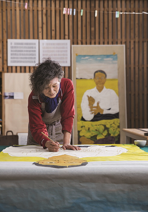 ‘윤석남’은 미술관 산책을 좋아하는 이들이라면 낯설지 않은 이름일 것이다. 주요 국공립 미술관의 소장 작가이고, 한국 여성주의(feminism) 미술의 대모라는 수식어가 자주 따라붙는, 다분히 상징적인 이름이기도 하니까. 정작 그녀를 만나고 싶다는 생각의 단초가 된 건 그런 무게감 있는 수식어가 아니라 어쩐지 따스하고 귀여운 매력이 풀풀 풍기는 작품이었지만 말이다. 지난해 말 수원시립아이파크미술관에서 진행 중이던 <내 나니 여자라>라는 전시를 보다가 마주친 ‘우리는 모계 가족’(2018)이라는 설치 작품이었다. 굵게 주름 잡힌 청색 커튼을 배경으로 5명의 여성과 한 마리 강아지가 사이좋게 모여 있는데, 윤석남 작가 본인과 그녀의 어머니, 언니와 동생, 딸, 그리고 딸이 키우는 암컷 강아지를 모델로 삼았다는 설명을 접하고는 절로 미소가 지어졌다. 그리고 2주쯤 뒤 경기도 화성에 있는 그녀의 아틀리에를 찾아갔다.