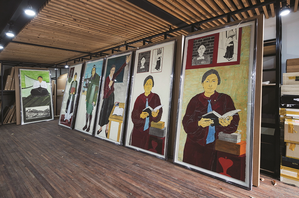 여성주의라는 수식어가 상업적 논리가 지배하는 갤러리 시장에서는 제약이 될 수도 있었겠지만 ‘윤석남’은 어느덧 브랜드가 되고 한국 현대미술을 대표하는 작가가 되었다. 9백99개의 목각 여인상 작업(‘999-빛의 파종’)으로 여성 미술가 최초로 이중섭미술상을 거머쥐고(1996년) 베니스 비엔날레 등 해외 유력 행사에 초청받았으며 영국 테이트 컬렉션의 소장 작가(‘금지구역 I’)가 되기도 했으니 말이다. 그런데도 기나긴 세월 동안 자기 자신에 대해서는 속 시원히 말할 수 없었다고 한다. “누군가에게 나의 존재를 알리고 싶어서 그림을 시작했다고 생각해요. 그런데 정말 ‘나 자신’에 대해서는 요만큼도 말할 게 없었던 거죠. 너무 부끄럽고, 그래서 내가 세상에서 제일 존경하고 사랑하는, 당당한 우리 엄마 얘기로 시작한 거예요.” 1990년대부터 조각이나 설치로 자화상을 담아내기도 하고 동시대 여성의 불안과 자괴감을 담은 작품(‘핑크룸’ 등)도 했지만, 스스로에 대한 봉인을 제대로 풀기 시작한 건 오래되지 않았다. 2018년 학고재에서 연 개인전 <윤석남>이 바로 그 봉인 해제의 무대였다. 그녀는 예전에 국립중앙박물관에서 본 윤두서 초상을 보고 매료된 기억을 살려 채색화를 배웠고, 동양화 기법으로 채색한 다수의 자화상을 학고재 개인전에서 선보였다. 자신의 얘기를 처음으로 전면에 끄집어냈다는 그녀는 이후 자신은 물론 소중한 벗, 그리고 이번에는 독립운동가의 초상까지 ‘초상 시리즈’에 몰두하고 있다. “초상을 공부하다 보니 조선시대에는 여성 초상이 거의 없었더라고요. 벼슬을 한 남자들만 있고. 은근히 화가 나고, 뭐가 이렇게 우럭우럭 올라오더라고요.” 이달 중순 학고재 개인전(2월 17일~3월 28일)에서 선보일 여성 독립운동가 초상의 경우에도 그녀는 할 말이 많다. 한 고위 관리가 동향 출신인 유관순을 알리는 데 맹렬히 나서는 바람에 다른 존재들은 묻혔는데, 실제로는 남쪽에 유관순이면 북쪽엔 동풍신이라는 기록도 있고, 대다수가 모르는 진실이 버젓이 있다는 것. 전시 제목은 <싸우는 여자들, 역사가 되다 — 역사를 뒤흔든 여성 독립운동가 14인의 초상>. 김이경 소설가가 동명의 책도 출간할 예정이다. 윤석남의 ‘허스토리(herstory)’는 앞으로도 쭈욱 궁금할 것 같다.
