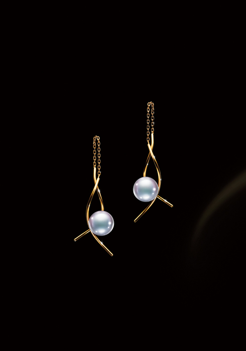 곡선 형태의 18K 옐로 골드 위에 7.5mm 아코야 진주를 세팅해 움직임에 따라 자유롭게 흔들리며 우아한 스타일을 완성해준다.