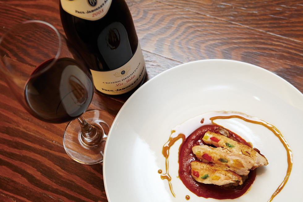 9 2012년 상반기 ‘발레 뒤 론 와인 아틀리에’에서 선보인 ‘파프리카로 만든 라타투이를 곁들인 그릴 치킨’, ‘한국인이 좋아하는 식재료와 론 와인의 만남’이라는 주제로 마련된 이 와인 디너에서는 참신한 마리아주의 미학이 돋보였다. ⒸChristophe Grilhe′(1, 7, 8 사진)