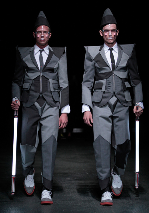 톰 브라운의 2015 S/S 컬렉션은 클래식한 패브릭으로 초현대적인 실루엣을 만들어내는 데 주력하며, 세계적인 모자 디자이너이자 제작자인 스티븐 존스와 컬래버레이션해 완성한 모자를 매칭했다.