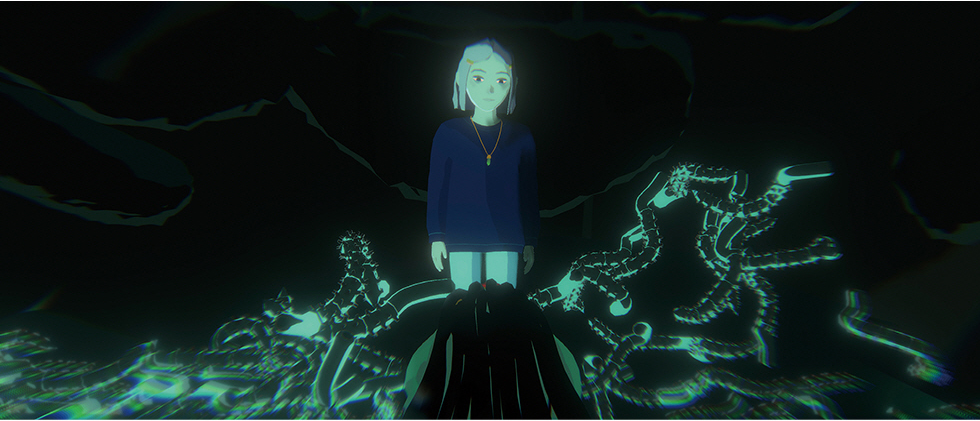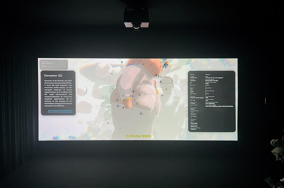이안 쳉은 이후 내러티브를 한층 강화한 작품을 신작으로 내놓는다. ‘BOB 이후의 삶: 찰리스 연구(Life After BOB: The Chalice Study)’(2021)라는 48분짜리 중편 애니메이션이다. 뉴욕의 더 셰드(The Shed), 프랑스 아를에 있는 루마 재단(LUMA Foundation), 베를린의 라이트 아트 스페이스(LAS)가 공동 커미션 작품으로 의뢰했고, 리움미술관까지 지원을 더해 탄생한 작품이다. 주인공은 신경공학자 아버지의 프로젝트로 뇌에 인공지능 BOB을 이식한 소녀 찰리스(Chalice)로 인생의 길잡이 같은 역할을 하는 AI와 공존하면서 진정한 나를 찾아가는 성장기를 담았다. 2074년 시점에서 열 살인 찰리스에게 BOB은 ‘최적의 인생 경로’를 시뮬레이션하면서 그에 부합하는 선택을 내리도록 이끈다. 48분의 시간이 속도감 있게 잘 흘러가는 이 작품에서는 인터넷이 세상의 모든 컴퓨터를 연결하듯이 인간의 신경계로 연결되는 ‘웨이비버스’라든지 인터넷 방송처럼 웨이비버스상에서 이뤄지는 방송인 ‘웨이브캐스팅’ 같은 작가가 만들어낸 개념이 나와 앞으로 펼쳐질 웹 4.0, 웹 5.0 시대를 둘러싼 상상력을 자극한다. 특기할 만한 사항은 이 작품을 상영하는 무대 하나로 끝나지 않는다는 점이다. 바로 옆 공간에는 ‘월드워칭’이라는 모드를 체험할 수 있는 상영관이 하나 있는데, 현장에서 링크를 통해 접속하면 작품 세계를 더 깊이 탐험할 수 있다. 멈춤, 재생 기능으로 관람 속도를 조절하고, 캐릭터 정보를 상세히 볼 수 있는 재미를 선사한다(‘MBTI’ 정보까지 나온다). 전시장이라는 공간적 제약, 그리고 한 번에 1명만 접속 가능하다는 점에서 인원 제약도 있긴 하지만 약간의 ‘개입’이 가능한 셈이다.