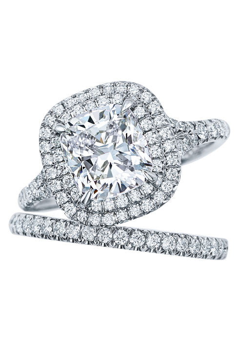 화려하면서도 여성스러움이 돋보이는 링으로, 화려한 두 줄의 비즈 세팅 다이아몬드가 중앙의 쿠션 모디파이드 브릴리언트 다이아몬드를 더욱 돋보이게 하며 우아함을 극대화한다.