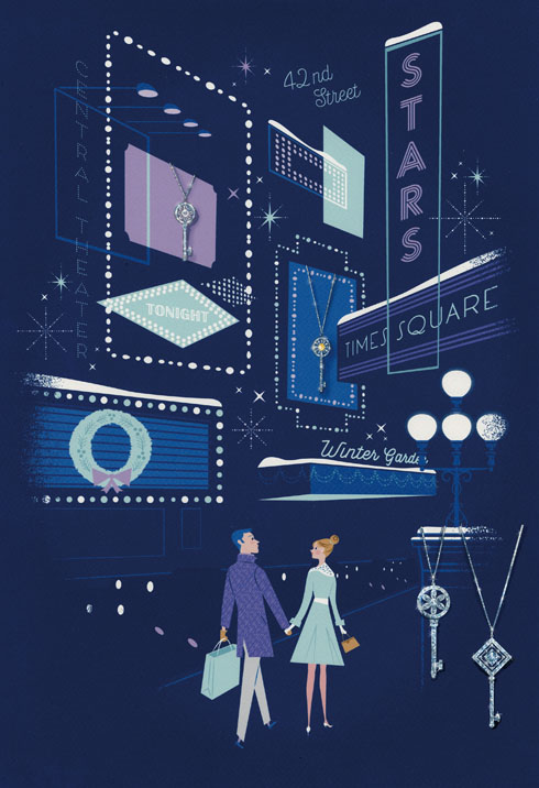 올해 티파니 홀리데이 쇼윈도 콘셉트는 1950~60년대 뉴욕의 홀리데이 전경을 담아 타임스스퀘어, 센트럴 파크, 록펠러 센터, 엠파이어 스테이트 빌딩, 티파니 플래그십 등 뉴욕의 대표적인 명소에서 즐거운 시간을 보내는 가족과 커플의 모습을 위트 넘치는 일러스트로 표현했다.