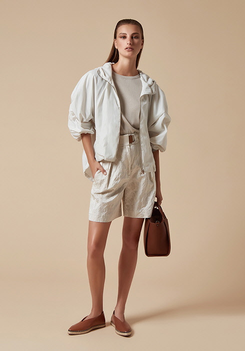 짧은 길이와 독특한 절개로 스포티한 느낌을 주는 점퍼는 바람막이로도 활용 가능해 실용성이 높다. 광택 효과를 준 버뮤다 쇼츠와 사다리꼴이 특징인 소가죽 브라운 컬러 백, 그리고 에스파드리유 슈즈는 다가올 여름 룩에 안성맞춤이다. 이번 S/S 리조트 컬렉션으로 아이보리와 브라운 컬러 매치가 멋스러운 캐주얼 룩을 완성해보자.