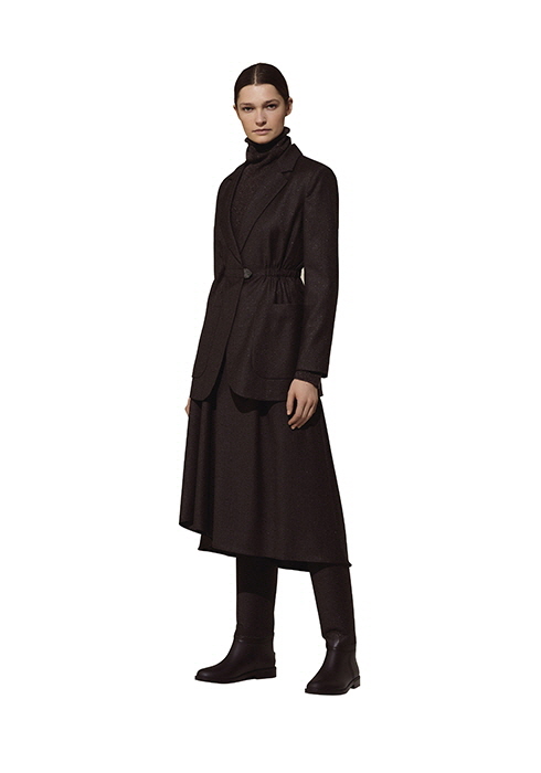 브라운 플란넬 재킷은 모직에 루렉스사를 더한 소재를 사용해 움직일 때 은은한 광택을 발한다. 스트링 벨트로 허리 라인을 강조해 날씬해 보이도록 했으며 클로징 버튼에는 모닐리 장식으로 포인트를 주었다. 여기에 자연스러운 드레이핑과 언밸런스한 라인이 매력적인 플란넬 스커트를 매치해 올가을 기품 있는 스타일링에 도전해보자.
