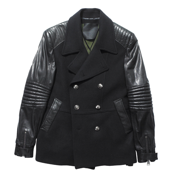 가죽을 부분적으로 매치한 더블브레스트 재킷과 카키 컬러 니트