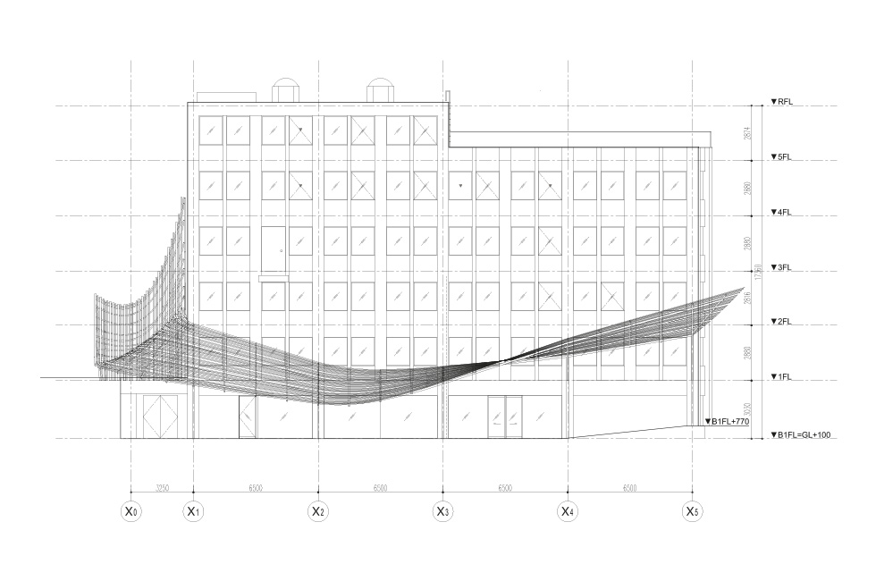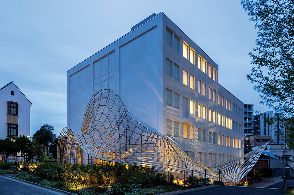 건물 내부에 자리한 터널의 존재를 외부에서 암시하기 위해 서쪽 파사드로부터 시작되는 나무 루버 프레임이 건물을 감싸고 있는데, 이 프레임은 각기 다른 폭으로 구성되어 남쪽으로 휘어가고, 마지막은 동쪽 하늘을 향해 사라져가는 분위기를 자아낸다. 이러한 구조 역시 구마 겐고가 하루키의 문학에서 느껴지는 바를 조형언어로 표현해낸 것으로, 독자는 하루키의 소설을 통해 새로운 세계로 빠져들지만, 그 세계 또한 확실한 게 아니라 언제든 윤곽을 잃고 사라질 수 있는 불확실성을 품고 있다. 이러한 불확실성이 건물 파사드에 고스란히 녹아들어 있기에, 하루키의 문학에서 느껴지는 모호함과 미지의 여정이 연상되기도 한다. 또 평범함의 대표 격인 박스 형태 건물과 비일상적인 모습인 파사드의 조화는 마치 하루키 문학 속 이항대립의 오묘한 어우러짐을 빚어낸 조형적 변주 같다.