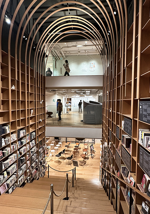 하루키 라이브러리의 하이라이트는 단연 ‘터널’ 공간이다. 구마 겐고는 지극히 평범했던 콘크리트 상자 모양의 와세다 대학 4호관의 층을 나누던 내부의 슬래브(slab) 2장을 제거하고 그 자리에 동굴 형상을 한 터널 공간을 만들어 넣었다. 터널 중앙을 잇는 나무 프레임 사이로 원래 자리했던 천장을 노출해, 공간에 깊이감을 부여하면서도 기존 건물의 정체성을 유지했다. 터널은 하루키의 문학을 사랑하는 독자들을 갑자기 다른 세계로 끌어내는 공간으로, 이 갑작스러운 전환의 매력이 하루키 소설의 핵심이라고 구마 겐고는 설명한다(구마 겐고가 이끄는 건축 사무소 KKAA 자료 참고). 그래서 터널을 일상에서 비일상으로 이끄는 체험 공간으로 설계했다. 책장을 넘겨 텍스트가 시각 정보로, 시각 정보가 뇌의 신경 정보로, 신경 정보가 가슴으로 들어온 순간 우리는 이야기 동굴에 완전히 빠져 들어간다. 이처럼 빠져 ‘들어감’이라는 문학적 의미를 조형적 표현으로 시도한 ‘터널’의 배경에서 문학과 건축의 미묘한 교차로 생겨나는 영감이 느껴진다.
