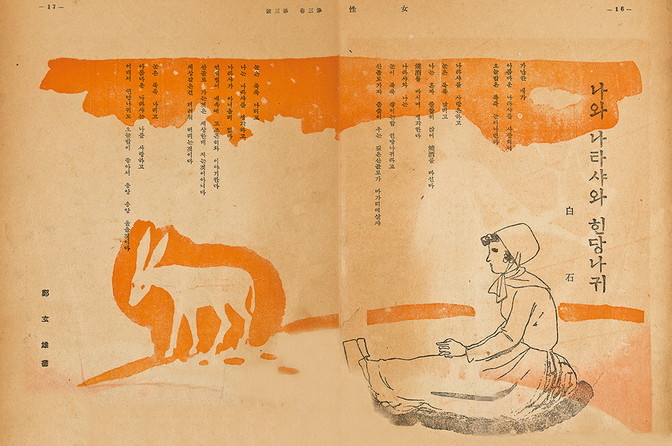 조선일보에서 발행한 잡지 <여성> 제3권 제3호(1938. 3)에 실린 백석의 시와 정현웅의 그림. 조선일보 출판부 편집자로 일한 백석과 정현웅의 인연으로 탄생한 수작. 아단문고 제공.