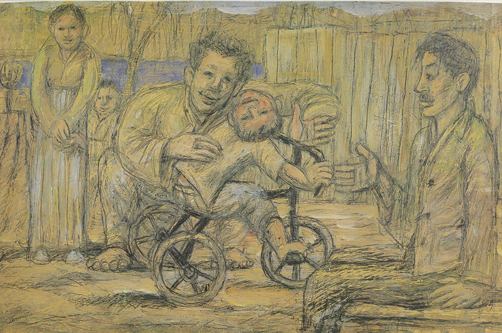 오래된 친구이자 신세를 지던 시인 구상이 자전거를 사서 이들을 태워주는 모습을 부러워하는 이중섭의 모습이 담겨 있다. 종이에 연필, 유채, 개인 소장.