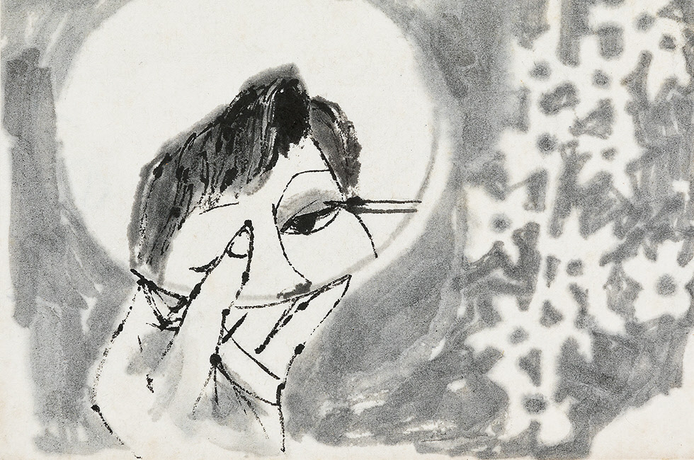 <여상(女像)>이란 잡지에 연재하던 ‘아뜰리에의 여백’이라는 고정란에 쓴 수필에 곁들었던 삽화. 종이에 수묵, 10.7 X 14.8cm, 개인 소장.