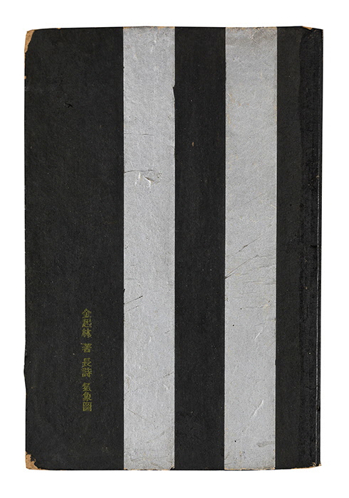 <중앙> 등에 연재한 장시를 모아 창문사에서 1936년 간행한 김기림의 첫 시집으로 두 번째 일본 유학을 떠나는 바람에 보성고보 동문인 이상이 편집과 장정을 도맡아 자가본으로 2백 부 출판했다. 작중 화자가 세계 지도를 따라 여행을 하는데, 일종의 문명 비판을 의도했다고 한다. ‘기상도’라는 제목이 조금씩 커지도록 한 입체적인 디자인으로 유명하다. 화봉문고 소장.