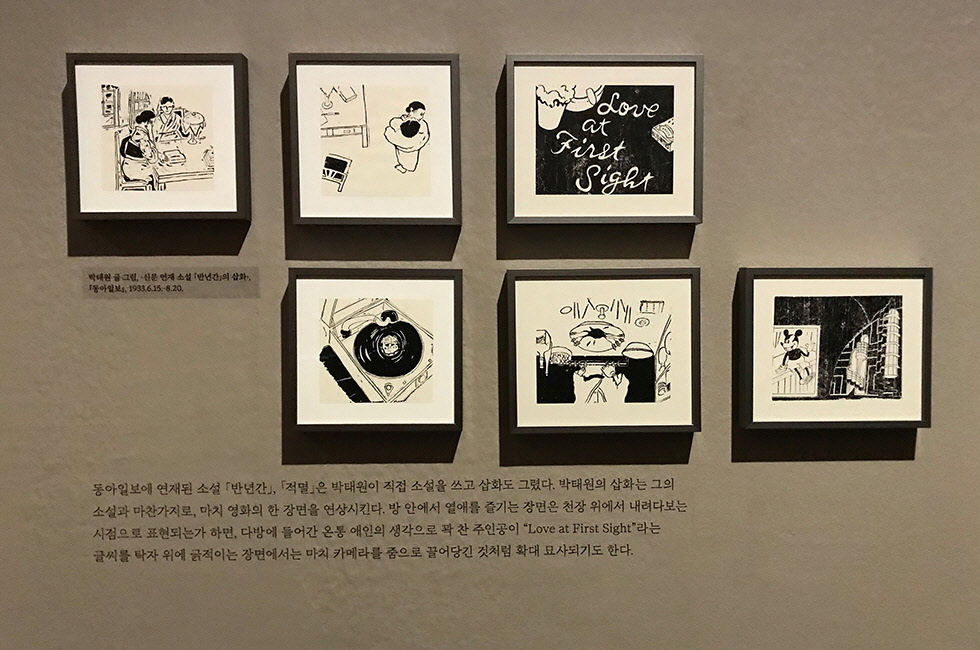 동아일보에 1933년 6월 15일부터 8월 20일까지 연재된 소설 <반년간>의 삽화. <반년간>과 더불어 동아일보에 연재한 소설 <적멸> 역시 구보 박태원이 직접 글을 쓰고 삽화도 그렸다. 박태원의 삽화는 소설과 마찬가지로 마치 영화의 한 장면 같은 느낌을 자아내는데, 그의 외손자가 영화감독 봉준호라는 점에서 ‘닮은 꼴’을 거론하지 않을 수 없다.