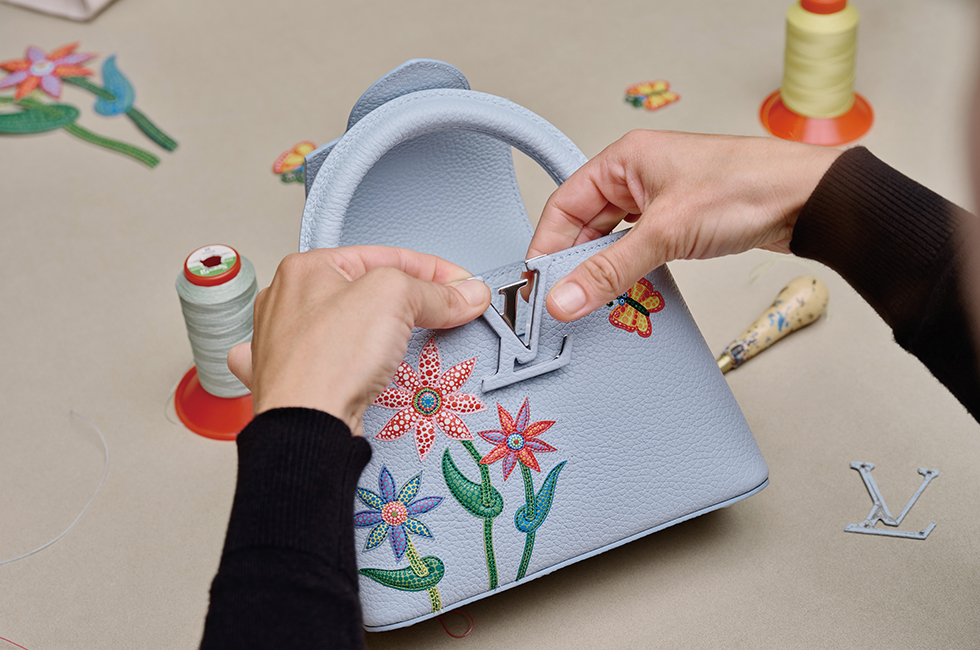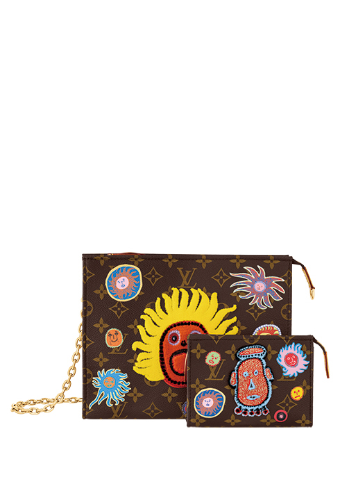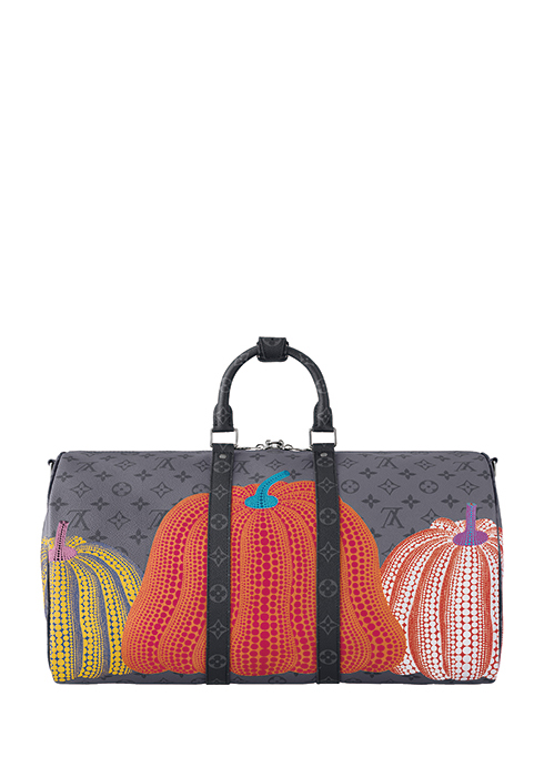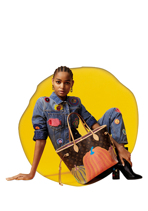 그 결과 두 세계를 온전히 상징할 수 있는 하나의 걸작이라 해도 과언이 아닌 컬렉션이 탄생했다. 패션이 패션을 넘어서는 순간, 콧대 높은 아트가 대중을 향하는 순간, 그 접점이 이 둘의 교집합이 되었다. 최상의 퀄리티를 위한 집념은 메종의 상징적인 제품들과 만나 발전했다. 어떻게 표현하고, 사람들에게 어떻게 다가가고, 일상에 어떻게 적용하며, 또 어떻게 감동시키고 변화하게 할 수 있을지에 대한 끊임없는 생각, 즉 무한함과 영원함을 위한 ‘어떻게’에 대한 고민과 집념은 그녀가 예술에서도 그러했듯 장인 정신에 대한 무한한 신뢰를 기본으로 상업적인 제품에 공예적 터치를 더해 성공적으로 완성되었다. 가방은 물론 남성복 및 여성복, 선글라스, 슈즈, 액세서리, 트렁크, 향수 등 남성과 여성 세계를 다 포괄하는 이 광범위하고 복잡한 컬렉션이 지난 3월 드롭 2를 공개했다. 주요 모티브는 호박, 꽃, 얼굴 그리고 인피니티 도트와 네트다.