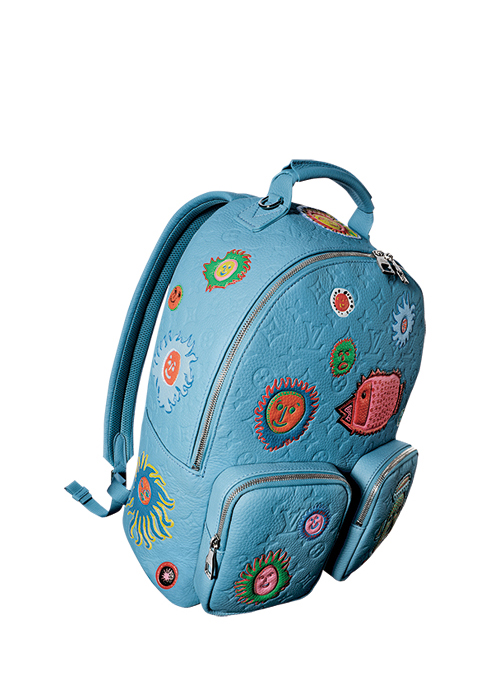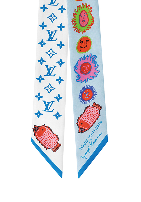 일본 소도시의 목가적인 환경에서 자란 쿠사마 야요이의 부모는 광활한 대지와 온실에서 종묘장을 운영했다. 그녀가 그림을 통해 기록한 생생한 어린 시절의 시각적, 청각적 환각이 주는 충격과 두려움을 완화해준 것이 꽃이다. 작가의 꽃은 바지와 치마, 드레스는 물론이고 카퓌신, 모노그램 앙프렝뜨 온더고, 스피디 백과 같은 가죽 제품과 향수병에도 프린팅되었다. 꽃과 함께 작가가 자주 다루는 소재 중 하나는 얼굴 문양이다. 2009년 시작한 저명한 시리즈인 ‘나의 영원한 영혼(My Eternal Soul)’의 즐거운 얼굴들은 쿠사마 야요이와 루이 비통에 의해 선택되고 변형되어 이 컬렉션의 독특한 캐릭터로 자리 잡았다. 이 모티브는 여성과 남성 컬렉션 곳곳에 등장하는데, 브랜드의 시그너처 컬러인 밝은 델피늄 블루 바탕의 하이퍼 프린팅과 강렬한 컬러의 자수 조합으로 만날 수 있다.
