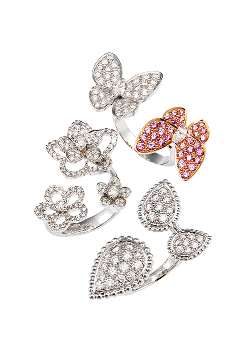 반클리프 아펠 투 버터플라이 비트윈 더 핑거 링 18K 로즈 골드와 화이트 골드의 두 나비 모티브에 라운드 핑크 사파이어와 라운드 및 마키즈 컷 다이아몬드를 각각 36개씩 세팅해 우아한 볼륨감을 선사한다. 3천7백만원. 문의 1877-4128