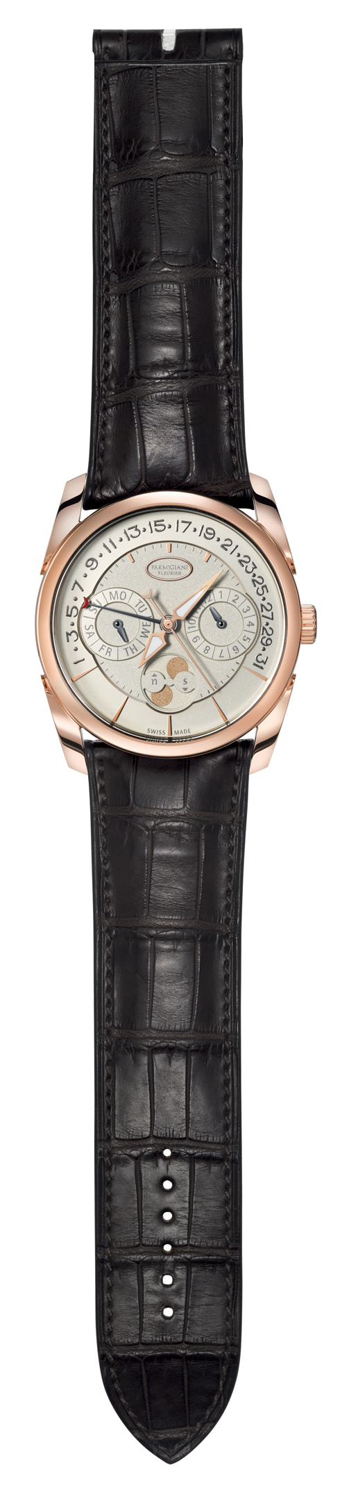 17번째 인하우스 무브먼트 PF339를 장착한 톤다 레트로그레이드 애뉴얼 캘린더. 4시에서 8시까지 270도 안에서 레트로그레이드 방식으로 날짜를 표시하고 6시 방향에는 1백20년에 한 번 조정하면 되는 문페이즈, 3시 방향에는 월, 9시 방향에는 요일을 표시한다.