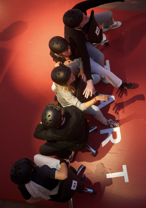 3 회전의자 레이싱 게임. 헬멧을 쓰고 등받이를 껴안고, 의자에 앉아 힘껏 출발!