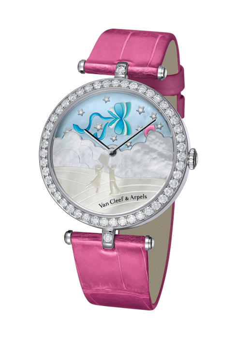 시간의 서사시, 시간의 아름다움과 그 속에 담긴 의미를 중시하는 반클리프 아펠의 워치 컬렉션은 그 모습만으로도 황홀할 정도로 아름답다. 젊은 남성과 여성이 하늘에 연을 띄워 소망을 빌고, 그들의 머리 위로 마치 발레하듯 즐겁게 춤추는 연을 형상화한 디자인이다. 머더오브펄의 완벽한 조화와 최고 등급의 다이아몬드를 세팅해 낮에는 연이 날고 있는 하늘을 묘사하고, 밤에는 별이 빛나는 하늘을 표현하기 위해 24시간 동안 디스크가 조금씩 회전하게 했다.
