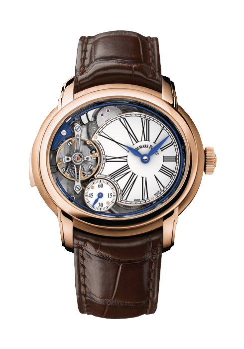 전기를 사용하기 전, 소리를 통해 시간을 들을 수 있도록 고안한 기능인 미닛 리피터. 오데마 피게는 워치메이킹 기술의 최고 경지라 불리는 미닛 리피터 워치를 이미 1875년에 선보인 바 있는데, 이러한 브랜드 노하우와 전통을 담아낸 새로운 모델이 바로 밀리너리 미니트 리피터다. 3차원적인 무브먼트에 획기적인 2개의 밸런스 스프링을 보유한 AP 이스케이프먼트와 미닛 리피터의 메커니즘이 만난 것. 창의적인 디자인에 핸드와인딩 칼리버 2928을 장착해 시, 분, 초 표시와 미닛 리피터 기능까지 갖췄다.