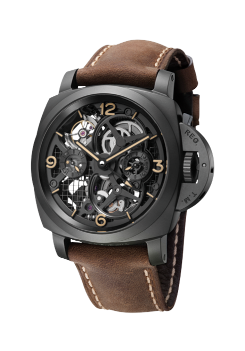 역사 깊은 이탈리아 브랜드 파네라이의 독특한 매력을 드러내는 자사 무브먼트를 장착한 스켈레톤 워치. 이 워치는 독특한 블랙 세라믹 베젤이 감싸고 있으며 인 하우스에서 설계하고 제작한 P.2005/S 무브먼트에는 투르비용을 장착했는데, 이 모든 움직임은 투명한 케이스를 통해 고스란히 볼 수 있다. 내부의 모든 디테일을 볼 수 있도록 마치 골격만 남긴 듯 브리지를 표현한 것도 독특하다. 2백77개의 부품을 사용했고 6일간 파워 리저브가 가능하다.