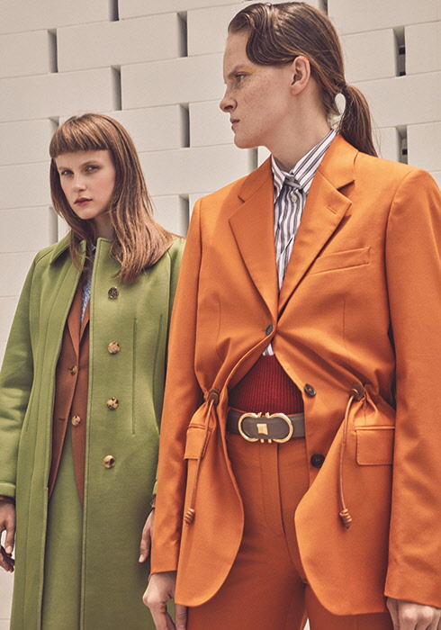 (오른쪽) 오렌지 컬러 재킷 3백9만원, 팬츠 1백15만원, 스트라이프 셔츠 99만원, 버건디 웨이스트 밴드 19만원, 가죽 로고 장식 벨트 57만원 모두 살바토레 페라가모. |