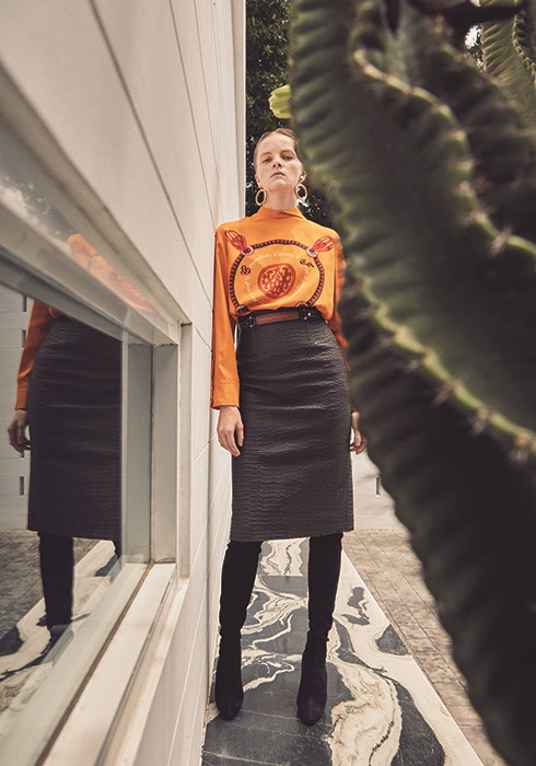 블랙 레더 스커트, 블랙 사이하이 부츠 모두 가격 미정 에르메스. 이어링 스타일리스트 소장품. |