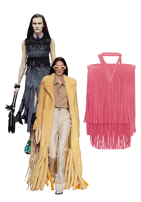 (왼쪽부터) Prada, bottega veneta, roger vivier 드라마틱한 율동감을 더하는 프린지 장식은 2020 F/W 시즌 런웨이 위 가장 주요한 디테일 중 하나. 컬러풀한 비즈와 원사, 원단으로 만든 프린지 장식을 대다수 룩에 적용, 유연한 동시에 강인한 여성상을 구현한 프라다가 대표적인 예다. 한편 프리폴 컬렉션에서 프린지 파우치로 폭발적 반응을 얻은 보테가 베네타의 다니엘 리는 과장된 프린지를 더한 코트, 점프 수트, 드레스 등으로 시각적 재미를 주는 동시에 트렌드에 대한 명확한 메시지를 전했고, 인트레치아토 기법을 적용한 새로운 스타일의 BV 프린지 크로스 백으로 뻔하지 않은 전개를 이어나갔다. |